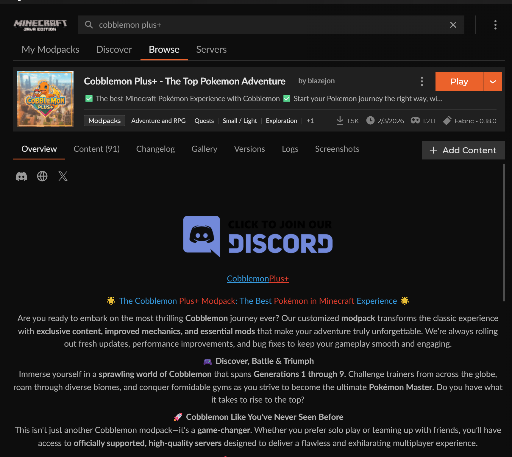 Next, install our Cobblemon Modpack through Curseforge. You can click on the button below to be taken straight to the Modpack page!
